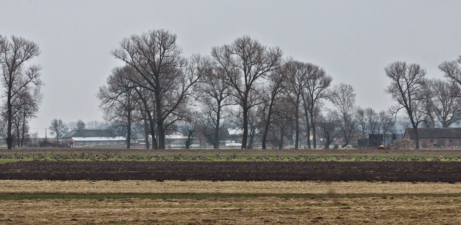 Szybko jednak zapomnieliśmy o aurze.Dookoła nas wszędzie były gęsi . Okrążając rejon,mój przewodnik,wykrył cztery duże stada odpoczywających gęsi.Określił je na minim 1500 szt każde.Białołoczelne,zbożowe i niewielkie domieszki gęgaw.Pan Łukasz przystawał,koło każdego stada,wyciągał lunetę i dokładnie je studiował,ptak po ptaku.Ja obok stałem z aparatem na statywie i obfotografowywałem wszystko systematycznie.Cierpliwe studiowanie stad, przez Pana Łukasza,wkrótce przyniosło rezultaty.Znalazł w nich rzadkich gości.Gęsi krótkodziobe i bernikle białolice.O ile bernikle,z racji ich charakterystycznego upierzenia,nie było trudno wyodrębnić z tłumu pierzaków,to wykrycie krótkodziobej,jest wyższą szkołą jazdy.Najpierw pokazywał mi je przez lunetę,potem ja to miejsce dokładnie wielokrotnie fotografowałem,a i tak w końcu,na zdjęciach musiał mi pokazywać palcem,które to są te cymesy.I tym się właśnie różni amator od profesjonalisty.Cały czas obserwowałem jak się zachowuje i co robi.Miałem okazje dużo się nauczyć i nie chciałem tego zmarnować.Oprócz dużych stad,na ziemi i w powietrzu,było też dużo małych stadek.Mistrz ocenił,że widzieliśmy tego dnia,sporo ponad 6000 gęsi.